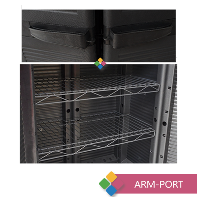 Armario de plástico polipropileno. Incluye tres entrepaños tipo rejilla. Se puede colocar candado