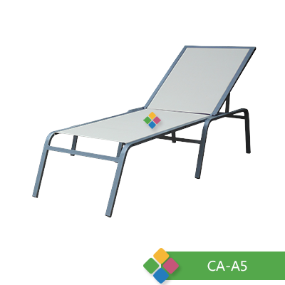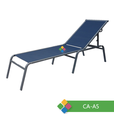 Camastro en estructura metálica en perfil rectangular Cal. 18, respaldo con 3 posiciones con descansa brazos o sin , malla Plástica  especial para U.V. Garantía de 5 años en decoloración al sol.