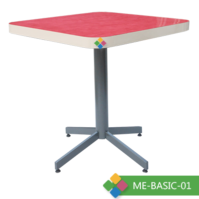 Mesas para Restaurante en material aglomerado laminado en formaica, pedestal metálico en pata de gallo o base en plato, pintado o cromado con niveladores.