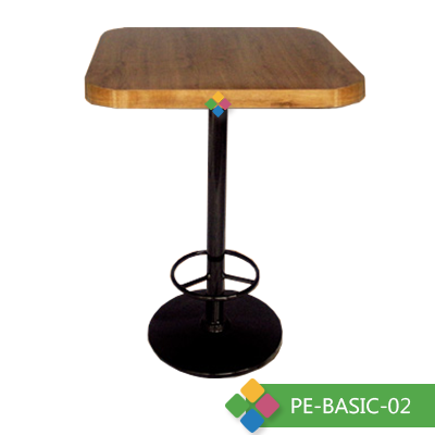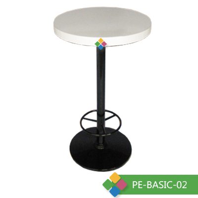 Mesas Periqueras en base de plato o pata de gallo pintada o cromada, cubierta cuadrada o redonda en aglomerado laminado en formaica lisa o texturizada.