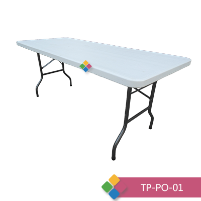 Tablón plegable en perfil de 1 1/4×3/4 ca.18, patas en tubo redondo de 1” en cal. 18. Pintura horneada tipo Silver Amartillado cubierta en plástico soplado en polietileno de alta densidad para interiores y exteriores.