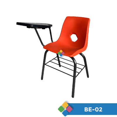 Pupitre escolar en tubo redondo de 1″ Cal. 20. Asiento de concha para adulto en plástico polipropileno, con parrilla incluida de 1/4″ y paleta plástica con porta lápiz.
