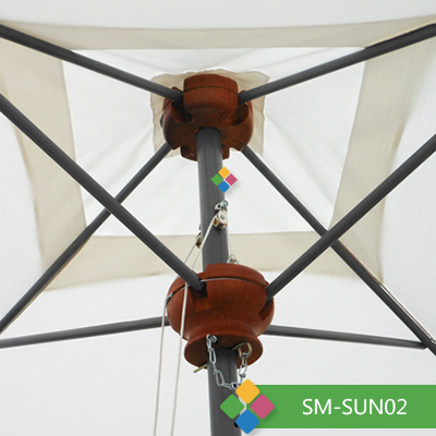 Sombrilla cuadrada en 4 brazos toldo de tela Sunbrella con rompe vientos.