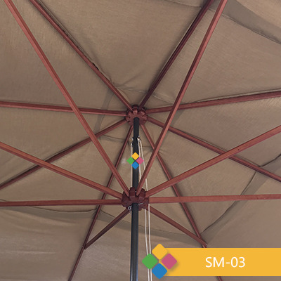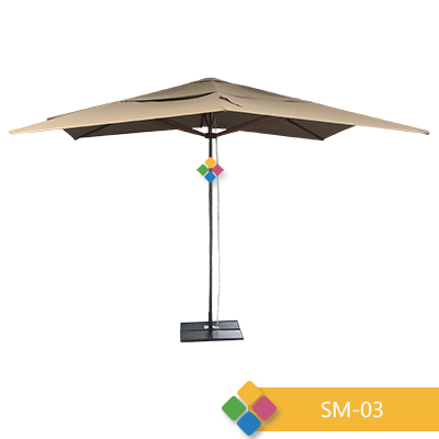 Sombrilla cuadrada de 8 brazos en madera de pino tipo carpa. Capucha de Tergal Stretch con rompe vientos. Poste central en tubo de 2″. Pintura de horno en color chocolate. Poleas de carga para su fácil apertura.